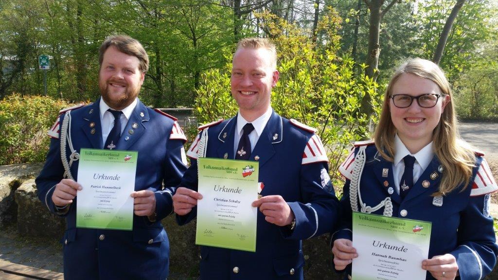 Herzlichen Glückwunsch! Wir gratulieren zum bestandenen D-Lehrgang des Volksmusikerbundes NRW. Von links: Patrick Hammelbeck D3, Christian Schulze D2 und Hannah Baumhus D2.