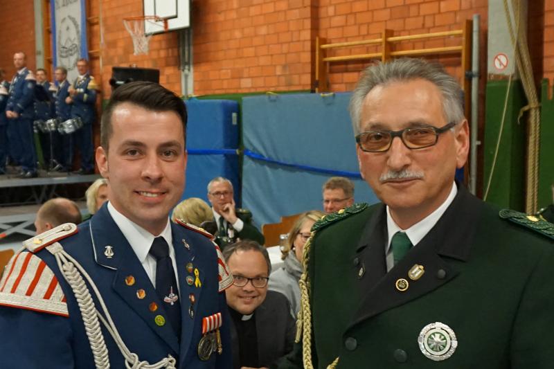 Beförderung und Gratulation! Oberst Peter Menze beförderte Stefan Hagemann während der Wintergeneralversammlung der St. Lambertus Schützenbruderschaft Langenberg am 28.01.2017 zum neuen Tambourmajor unseres Spielmannszuges.