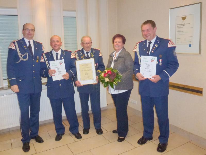 Im Rahmen des Kameradschaftsabend am 16. November 2013 wurde Herr Heinz Schlepphorst als Dank für sein kameradschaftliches und vorbildliches Wirken zum Wohle des Spielmannszuges zum Ehrenmitglied ernannt. Für 25 Jahre Mitgliedschaft wurden Dirk Lütkehellweg und Detlef Meier vom Volksmusikerbund NRW ausgezeichenet. Unser Bild zeigt von links nach rechts: Klaus Schlütermann, Dirk Lütkehellweg, Heinz Schlepphorst, Christa Schlepphorst und Detlef Meier.